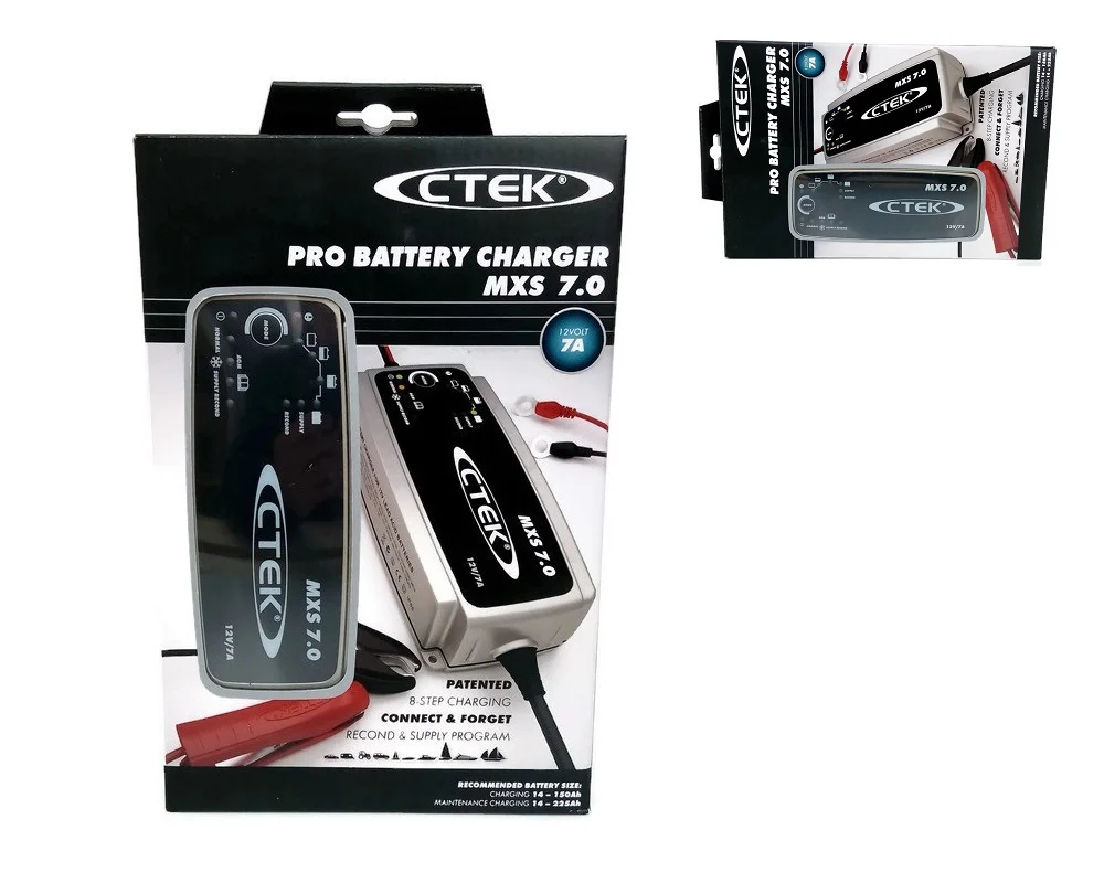 Ładowarka impulsowa CTEK MXS 7.0 zalecana jest do wszystkich rodzajów akumulatorów kwasowo-ołowiowych, w tym elektrolitowych, bezobsługowych, żelowych, wapniowo-wapniowych oraz AGM o pojemności 14Ah do 150Ah. Ładuje napięciem 12V a jej maksymalny prąd ładowania wynosi 7A.