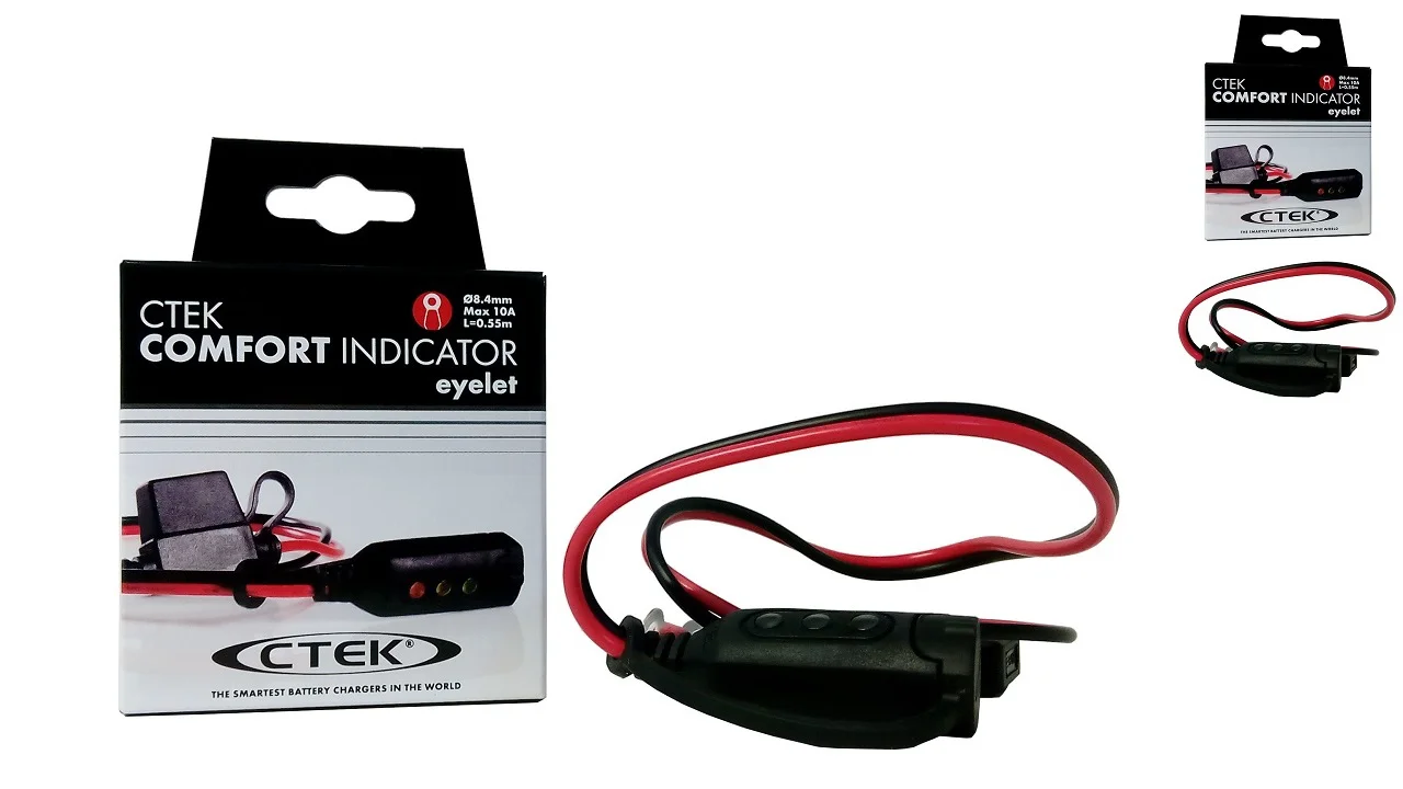 Końcówka diodowa naładowania akumulatora, wraz ze specjalną szybko złączką ułatwiającą podłączenie do ładowania. Długość kabla 0,55m, max. prąd ładowania 10A, zakończony oczkiem M8, wskaźnik diodowy. Oznaczenie wg producenta CTEK 56-382.